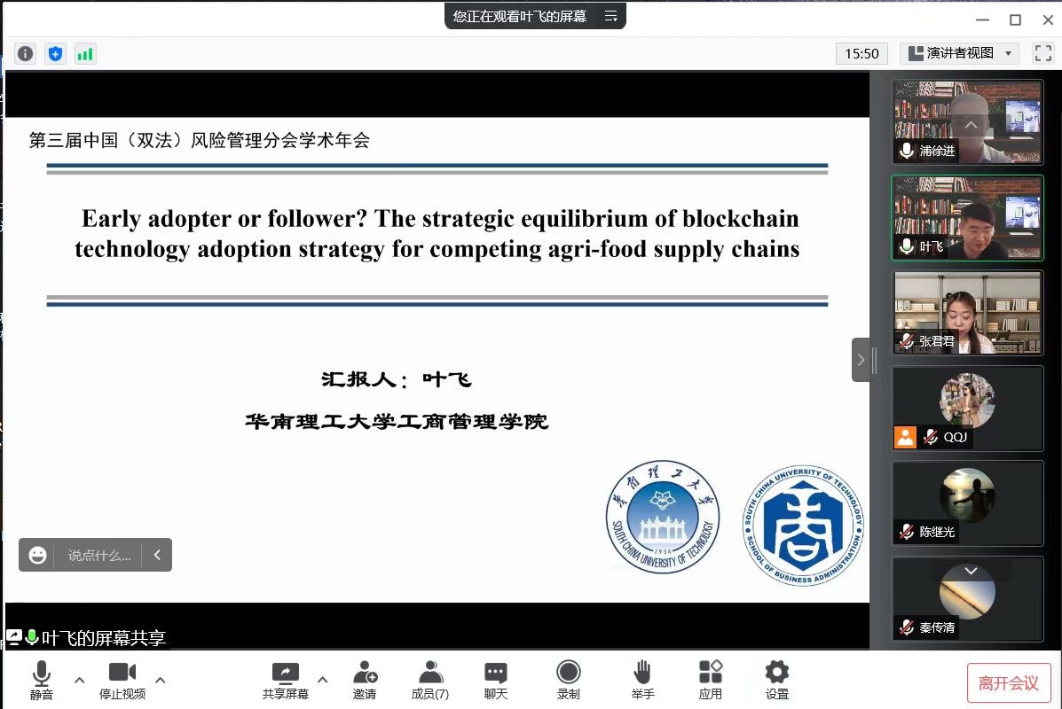浦徐进教授等四位专家、业界人士作为演讲嘉宾,四位专家、业界人士分别以“Early adopter follower? The strategic equilibrium of blockchain technology adoption strategy for competing agri-food supply chains”、“Subsidy for supplier quality management under information asymmetry: process development vs. transparency”、“基于区块链的农产品溯源体系案例研讨”、“我国特殊食品行业发展的特征、问题以及趋势”为题作了精彩的演讲。此次分论坛的举办,不仅为食品安全风险治理领域的学者与业界人士提供了交流平台,也推动了春满四合院