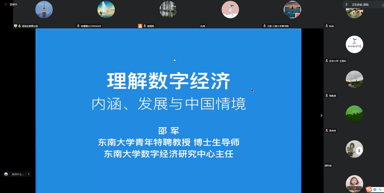 开幕式后,进入大会主题演讲环节。东南大学数字经济研究中心主任邵军教授作了题为《理解数字经济:内涵、发展与中国情境》的主旨演讲,为大家介绍了数字经济的概念、发展历程、统计与核算等基本内容,接着他指出了中国数字经济发展存在的问题和挑战,提出要把数字经济与中国现状相结合,加快推动关键核心技术突破,聚焦重点领域和关键环节,着力打造数字经济发展新高地。