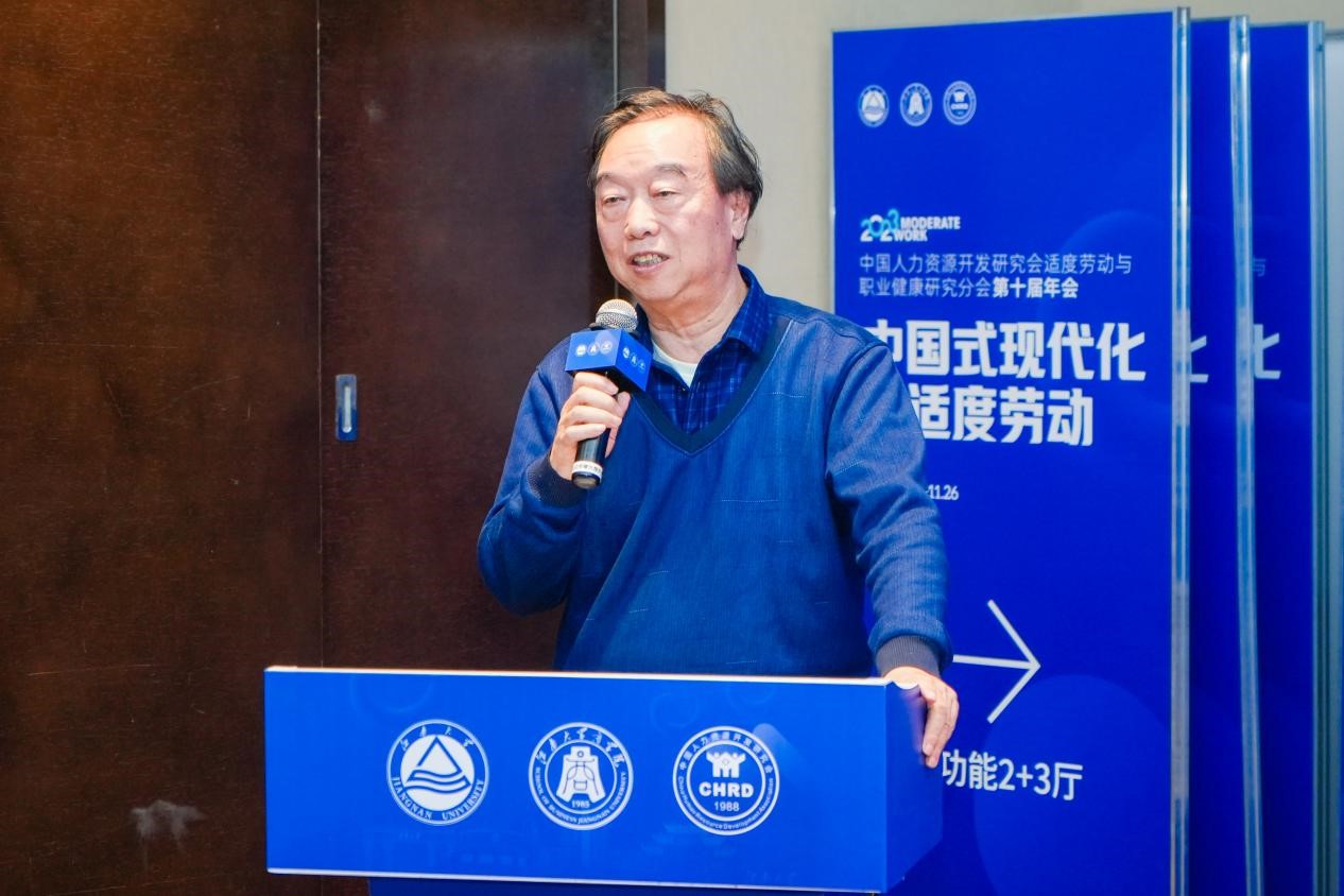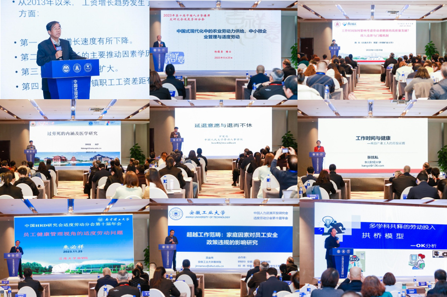博士生导师、科研处副处长吴金南教授;中国人力资源开发研究会适度劳动与职业健康研究分会会长,国家级教学名师、国务院政府特殊津贴专家、首都经济贸易大学二级教授、博士生导师杨河清教授等九位专家作为演讲嘉宾,分别以“中国工资增长与差距近期状况”、“中国式现代化中的农业劳动力供给、中小微企业管理与适度劳动”、“工作时间如何影响考虑劳动者健康的高质量发展?投入边界与门槛机制”、“延退意愿与退而不休”、“过劳死的内涵及医学研究”、“工作时间与劳动者健康状况:来自产业工人的经验证据”、“员工健康管理视角的适度劳动”、“超越工作范畴:家庭因素对员工安全政策违规的影响研究”、“多学科共释的劳动投入拱桥模型——OK分析”为题作了精彩的演讲。报告专家从多角度、全方位介绍了适度劳动研究动向,既有理论高度,也有实践深度,会场研讨气氛极为热烈。