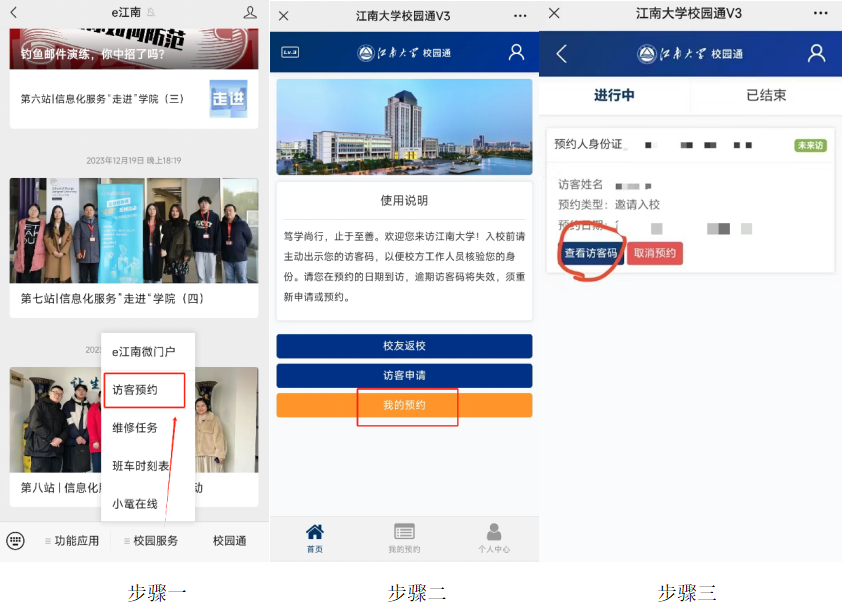 手机关注“e江南”微信公众号,点击屏幕下方“校园服务”中的“访客预约”,进入后点击“我的预约”,点击“查看访客码”即可获得访客码。进入校园时出示访客码。