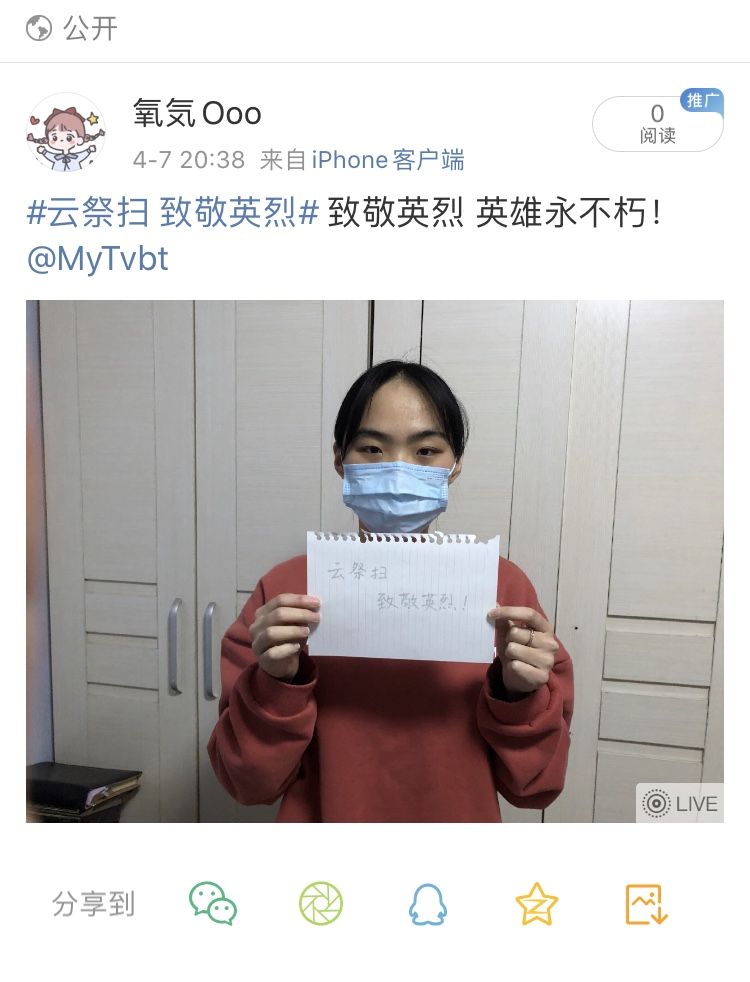党委在微博上共同发起了#云祭扫,致敬英烈#的话题活动,号召全体学生党员通过微博表达对革命先辈和抗疫英雄的缅怀与哀思,佩戴口罩与写有“云祭扫·致敬英烈”标语合影并上传微博,圈出自己身边的同学进行接力传递。截至4月8日最新,该话题已达到3.8万的阅读量,商院学生党员真正做到在“学思践悟”中不忘初心、牢记使命,身体力行地带动着身边更多的青年学子传承和弘扬革命精神。