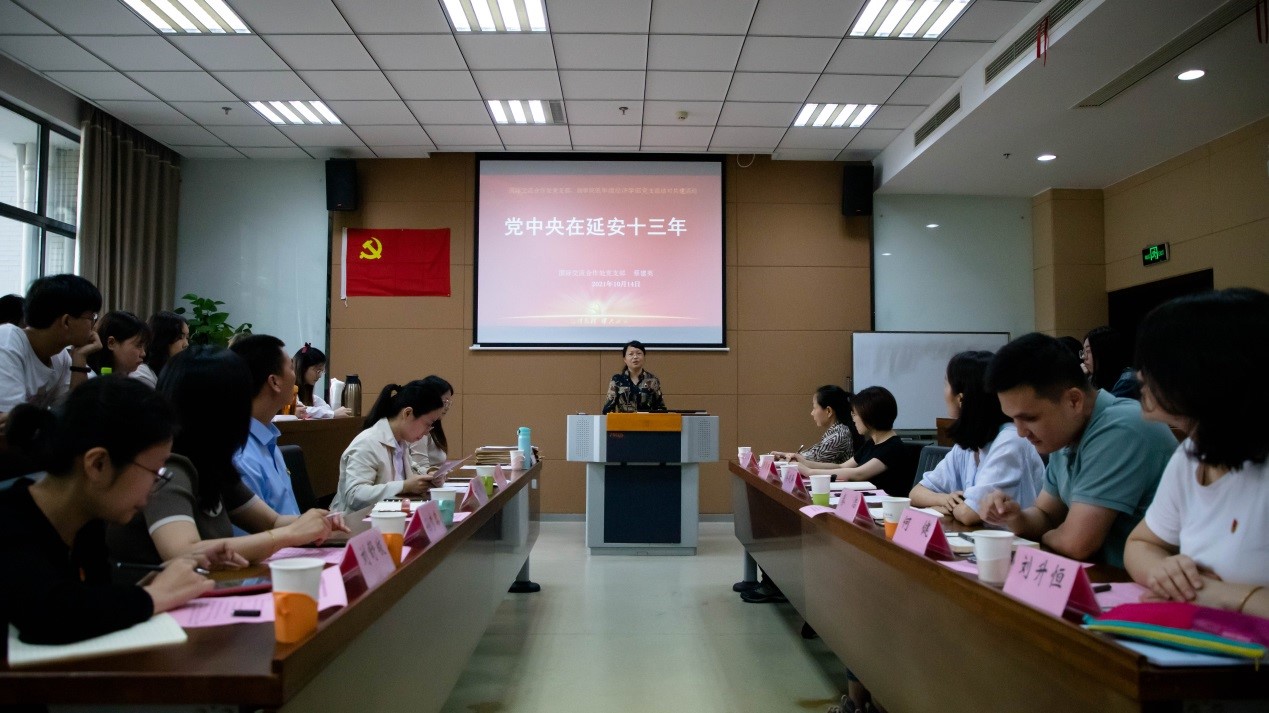 随后,蔡建英以“党中央在延安十三年”为主题就延安精神进行支部书记专题党课,党课从党中央在延安13年的光辉历程、辉煌功绩及基本经验三个部分展开,阐述了我党在延安的历史活动和重大意义。全体党员通过深入浅出的演讲了解了延安精神的灵魂、精髓、核心和突出特征,在场的党员对延安精神进行了热烈的讨论。徐静强调了延安精神是9月29日第一批纳入中国共产党人精神谱系的伟大精神。勉励同志们进一步理解党课所体现的延安精神的来源、内涵及启示。在讨论中,秦洁作为教师党员代表结合部门实践工作对党史学习教育做出了深刻的感悟。她讲到,着眼历史,也立足现在和未来,希望能够将延安精神所体现出的使命感外化为现实工作中的优良品质,为党育人,为国育才。呼吁全体学生党员拓宽国际视野,懂国际规则,积极参与国际竞争,明确个人方向,为中华民族伟大复兴增砖添瓦。春满四合院