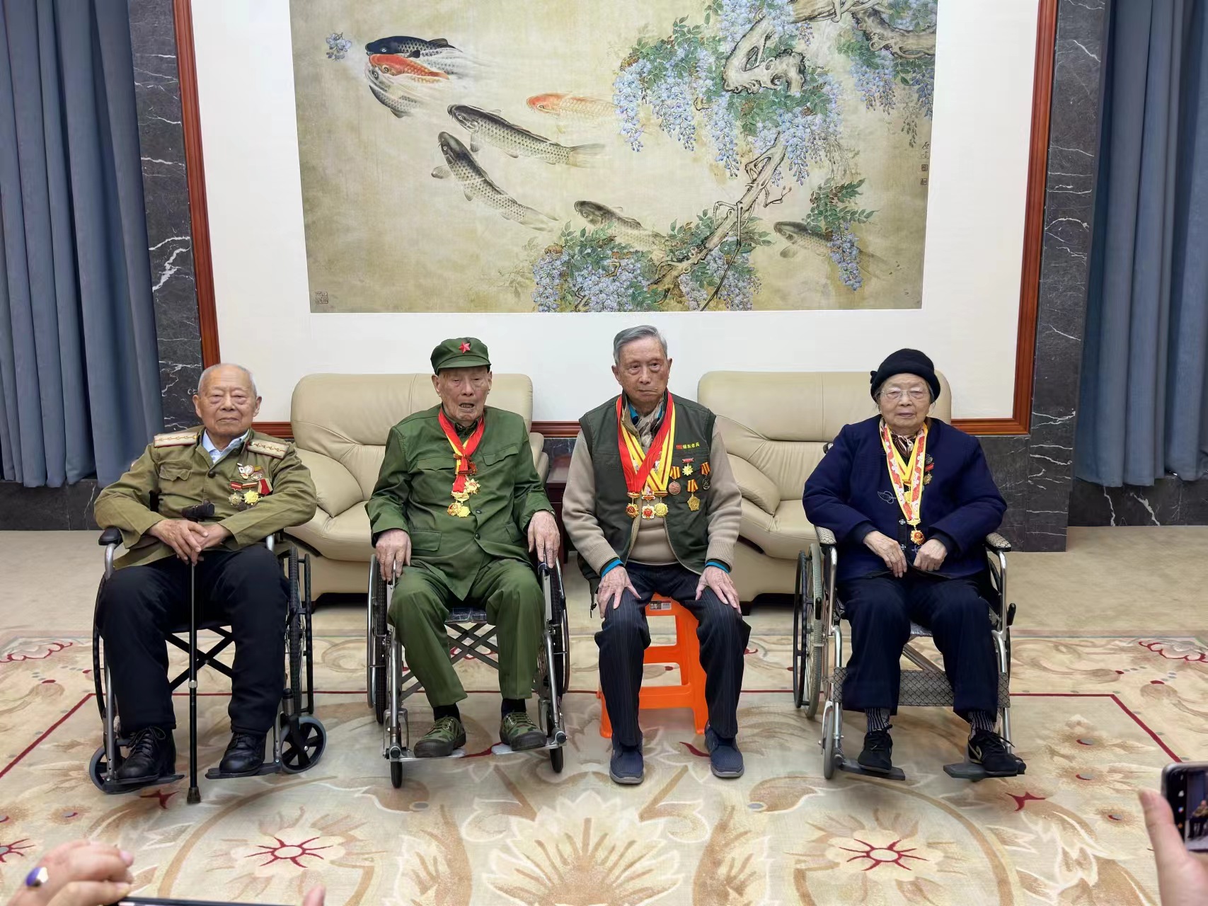 新四军老兵合影(左起:朱凤仪 胡新 张德勤 朱琳琅)