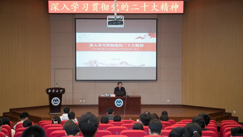 刘淼讲授了党的二十大总体概况、党的二十大报告主要内容,对党的二十大精神进行了全面宣讲。他指出,习近平总书记在党的二十大报告中提出了“建设中国式现代化”的重要论断,深刻理解和把握报告中蕴含的一系列新思想、新观点、新要求,是不断谱写中国式现代化新篇章的内在要求。对广大青年学生而言,要增强使命感与责任感,做到对党在政治上、思想上、行动上、文化上以及情感上的高度认同,不断提升学习能力与工作水平,为全面建成社会主义现代化强国、实现第二个百年奋斗目标,以中国式现代化全面推进中华民族伟大复兴而努力奋斗。