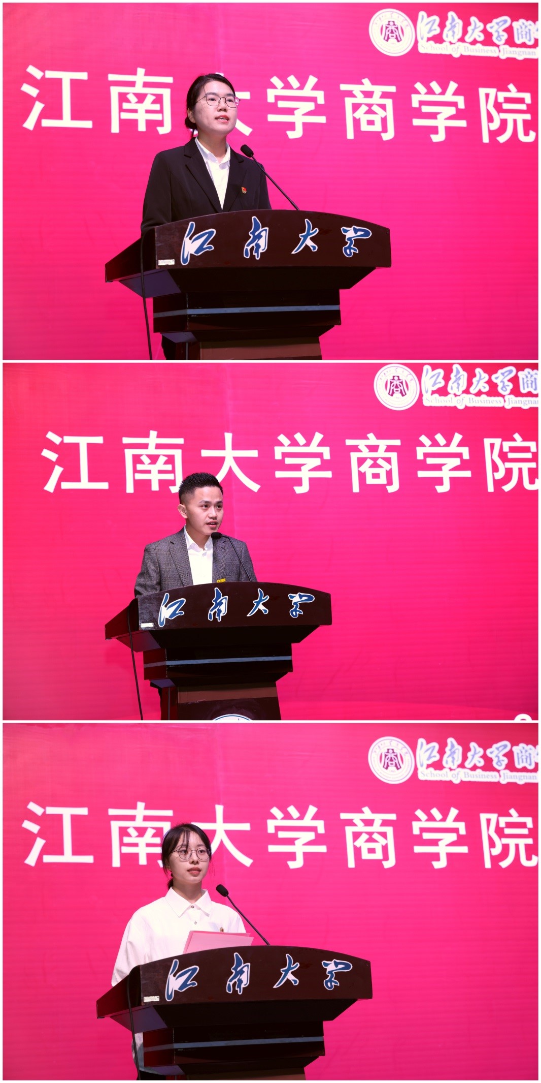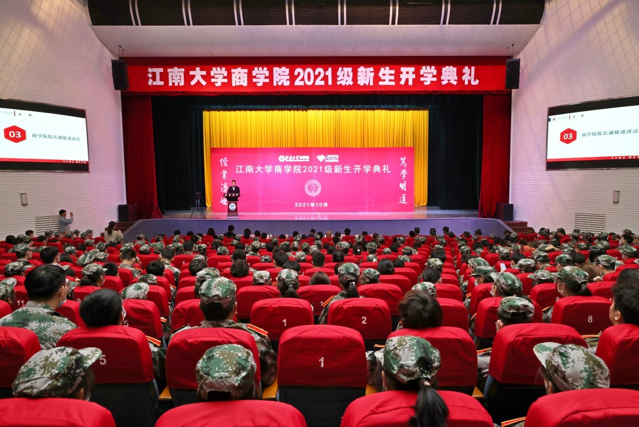 的历史沿革、学科建设发展情况,坚持立德树人根本任务,培养“全球视野、中国情景、知行合一”复合创新型经济管理人才的办学理念。他在发言中指出,新一级同学的加入,为不断攀登高峰的江南学府注入了新的活力。“笃学尚行,止于至善”的校训品格和“笃学明道,经业济世”的院训精神,要在新一代“江南商院人”的身上传承下去,并被赋予新的时代内涵。对此他向新生提出了三点希望:一是,笃学尚行,止于至善,做不忘初心的创造者。明确自己的奋斗目标,自觉地在学习中增强创新意识,时刻保持积极奋发的学习劲头,充分挖掘潜能,成为一名政治思想过硬,同时又具备良好科学素养、人文精神以及创新意识的人。二是,少作抱怨,擅于改变,做敢破敢立的逐梦人。勇于跳出舒适区,注重培养自己的综合能力,包括正确认识自我和自我定位的能力,独自面对失败的能力。希望同学们尽快熟悉新环境,融入新集体,并提醒同学们常常问候牵挂他们的父母。三是,建功立业,奉献青春,做勇于奋斗的实干家。当代中国青年与新时代同向同行,生逢盛世,重任在肩,每位同学都要做勇敢的开拓者,做一个有责任感、勇于担当的人,不断锤炼意志,拥有自信积极的心理状态、宽容大度的处事态度。最后浦院长祝愿同学们怀家国天下,立鸿鹄之志,梦圆江南,收获成功,成为未来建设社会主义现代化强国的栋梁之才。