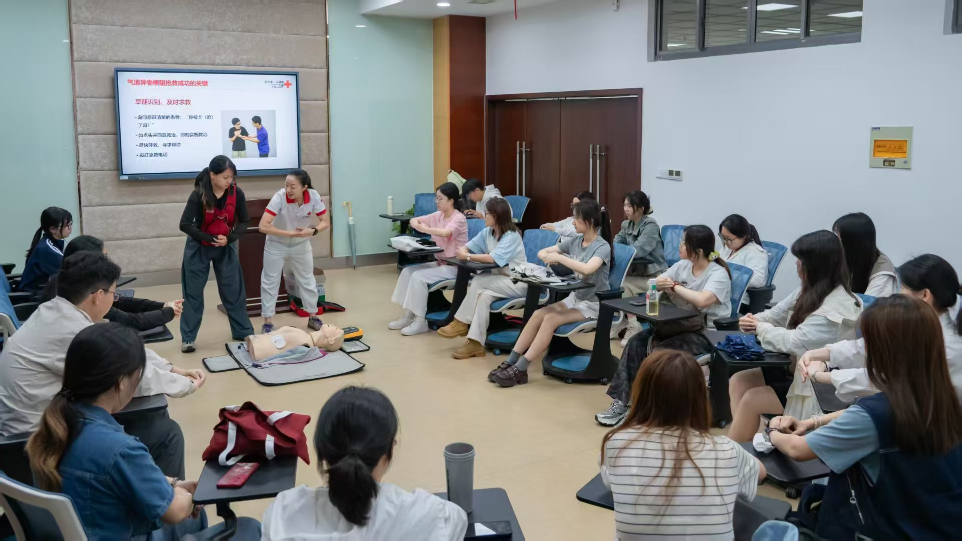 在实操教学环节,陶晓通过分步骤演示详细讲解了心肺复苏(CPR)和自动体外除颤仪(AED)的使用规范,并邀请同学模拟病患,现场演示体位调整等关键操作,让同学们更加清楚明了地掌握急救要领。在模拟实操环节,学员们积极参与规范演练,在动手实践中巩固了所学急救技能。