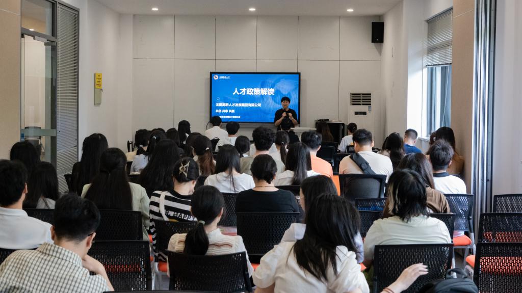 企业宣讲会环节,无锡高新人才发展集团有限公司、无锡农村商业银行股份有限公司、中信证券股份有限公司无锡分公司、永安期货股份有限公司、英科再生科技有限公司、美宜佳(江苏)便利店有限公司等6家进行招聘宣讲,为同学们详细介绍了留锡政策以及银行、证券、期货等相关企业的招聘需求、发展路径及福利待遇。