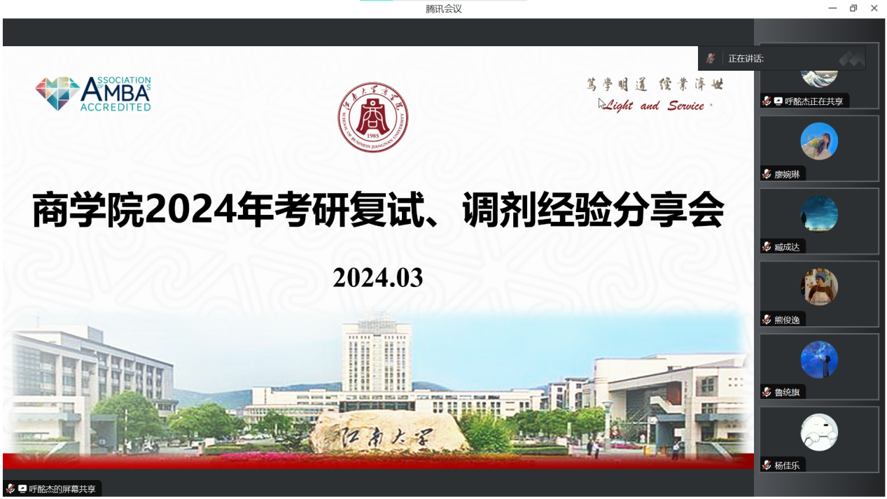 117会议室和线上腾讯会议同步开展。本次分享会邀请了2019级高吾雨、鲁统旗、臧成达、甘晓倩,2018级李思雪五位成功上岸的学长学姐分享自己考研复试、调剂心得。共计68名2020级本科生参加分享会。