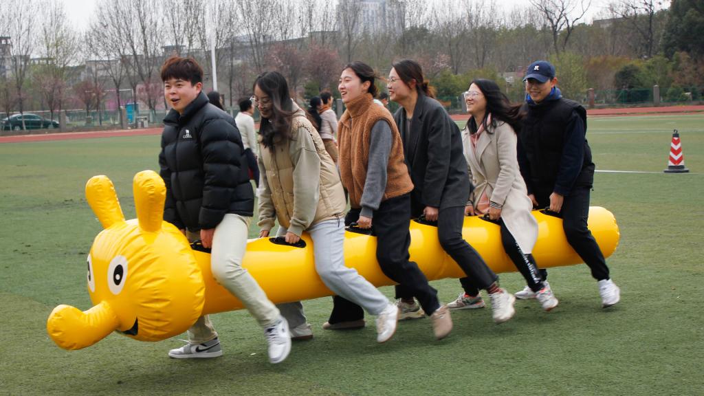 教职工共分为行政队、学工队、营销队、金融队、会计队、国贸队以及管工队七支队伍。运动场上,毛毛虫竞速、团队跳绳、同心鼓、花毽围踢等精彩缤纷的比赛项目逐一进行。