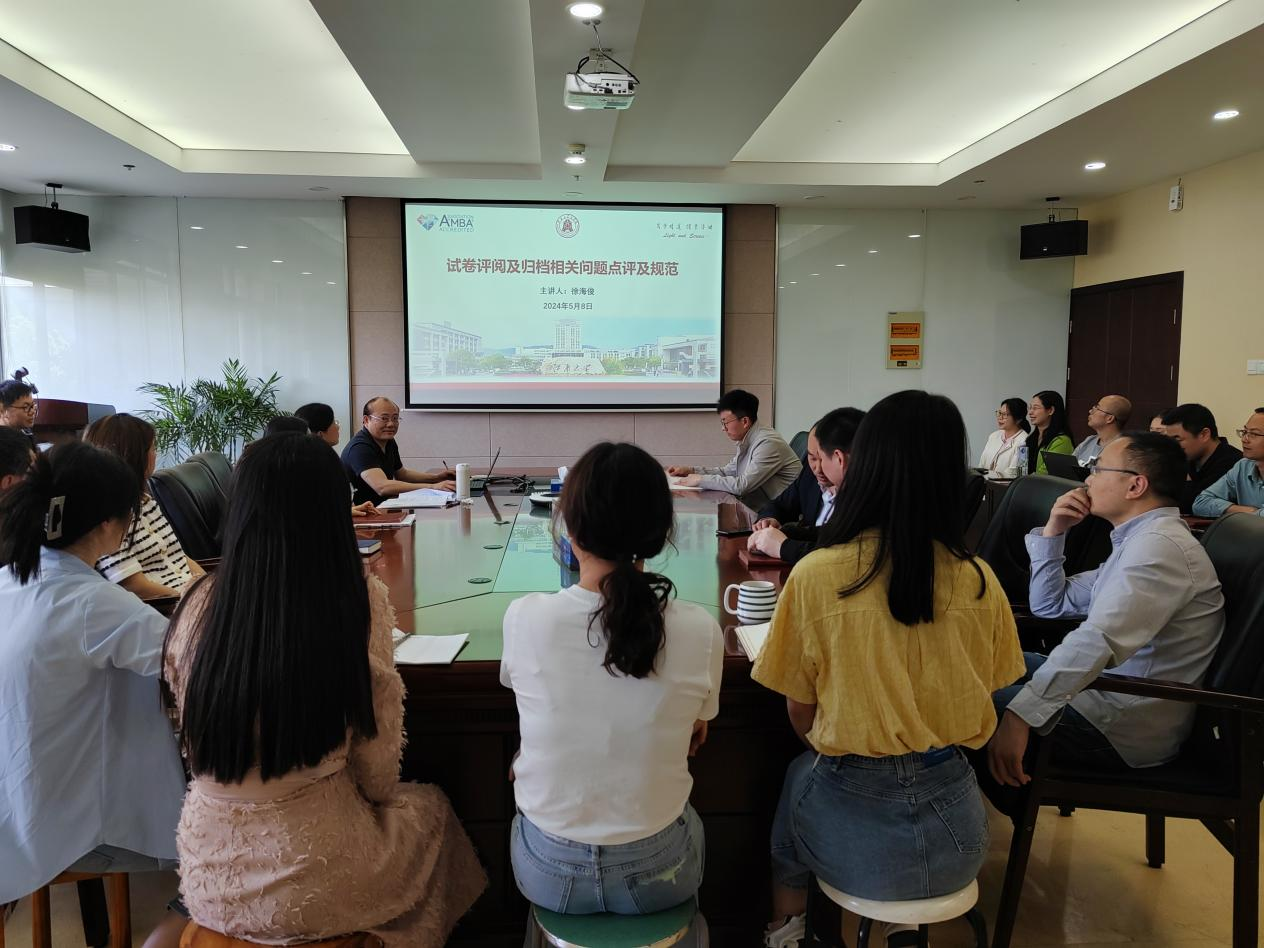 核查发现全院总体情况良好,教学文件归档较为齐全、试题难度较为得当、评阅流程较为规范,但在核查过程中也发现了一些问题,如存在材料漏装少装、个别阅卷不够规范等情况。为此,学院于5月8日下午组织学院教师进行专题培训。培训会上,学院教学督导组组长徐海俊副教授就核查发现的各类问题进行了细致分析,并向参与学习的教师详细介绍了如何合理出题、规范阅卷、正确归档的具体要求,以避免教学文件归档中出现教学事故。