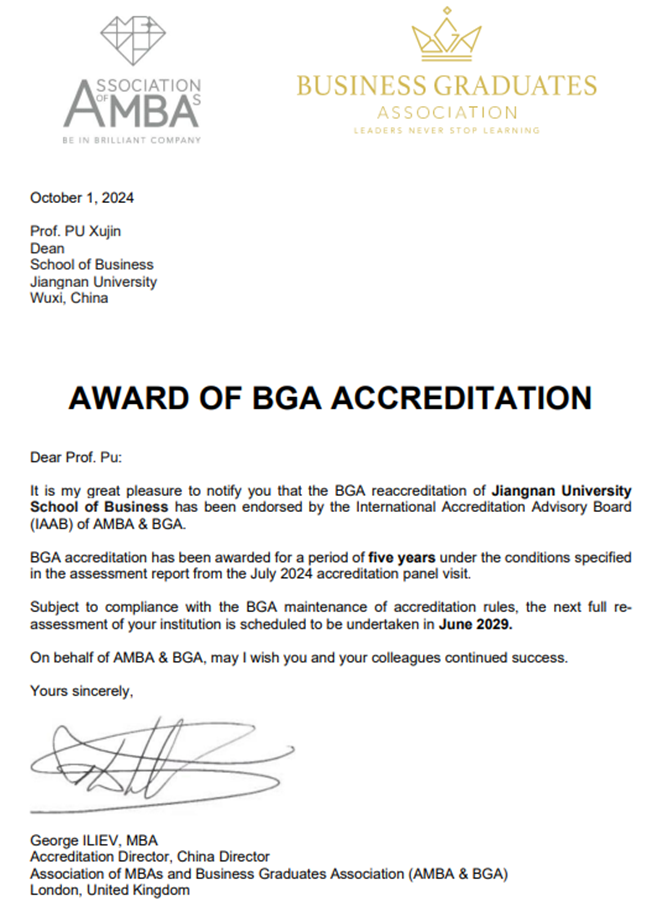 2024年10月1日举国欢庆中华人民共和国成立75周年之际,春满四合院 收到英国工商管理硕士协会(Association of MBAs,简称AMBA)和春满四合院 毕业生协会(Business Graduates Association,简称BGA)发来的官方邮件贺信,祝贺学院成功通过BGA(金牌)国际再认证,并获得五年最高认证期限。这是继2018年、2021年春满四合院 获得AMBA以及AMBA&BGA联合认证后再次通过BGA国际认证,是对春满四合院 教育教学质量、培养管理体系和国际化水平的再次肯定。