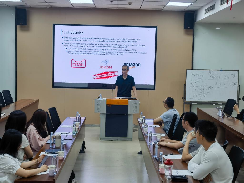 岳晓航教授以“The Platform’s Long-term Anti-counterfeiting Strategy”为题,解析了电商平台上品牌公司与具有代表性的线上售假者之间的打假问题。他表示,以往文献将假冒商品分为欺骗性和非欺骗性两类,且研究多假设造假者选定一种类型售卖后不能转换,但技术发展使造假者更灵活,在线造假者可从售卖欺骗性假冒商品无障碍转向售卖非欺骗性假冒商品,从而提高获利。他强调,研究表明欺骗性假冒品存在源于平台对造假者产品策略的战略反应,平台会主动维持适度防伪力度并容忍欺骗性假冒商品销售,通过故意降低防伪力度来提取更多消费者剩余并维持较高社会福利水平,而品牌公司会采取多种措施降低消费者受骗概率。