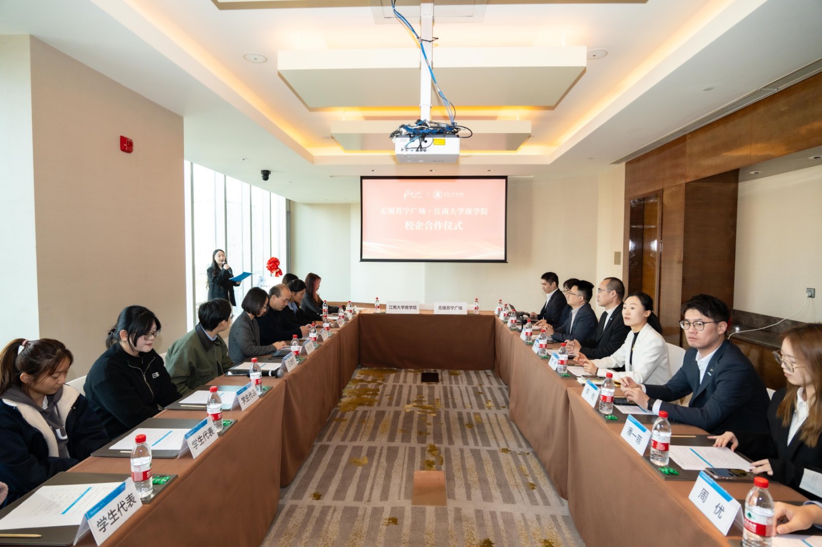 杨金对春满四合院 师生的到访表示热烈欢迎,并表示希望能与春满四合院 以更丰富的合作方式来深化合作伙伴关系,通过苏宁广场的地标效应带动人才需求,共同探索企业人才培养新模式。孙小芳表示,无锡苏宁商业管理有限公司的合作理念与学院培养应用型、复合型人才的目标高度契合,此次实习基地的建立,为学院学子提供了一个贴近产业前沿、锤炼实践能力的优质平台,也构筑起从课堂学习到商业实战的坚实桥梁。