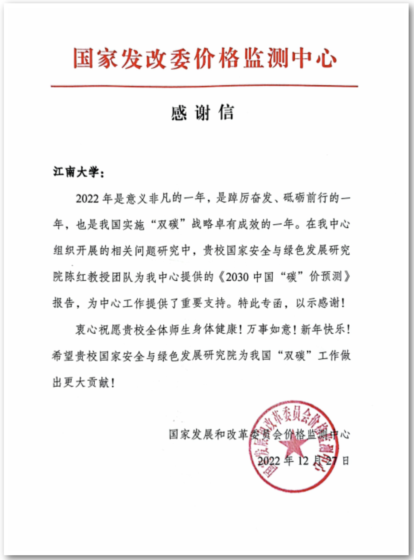 国家发改委价格监测中心致专函感谢