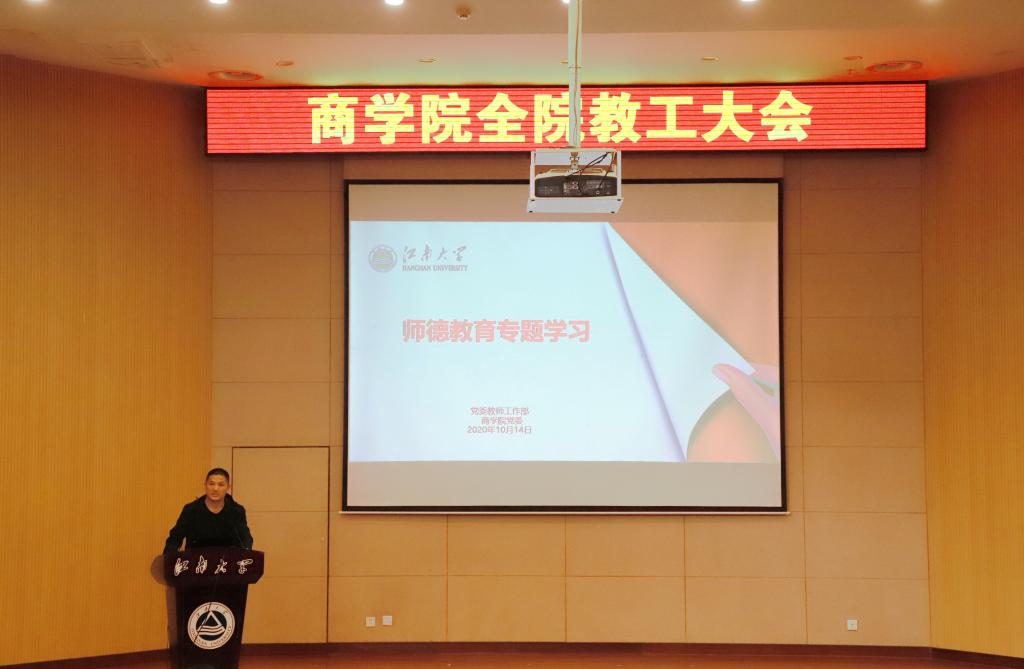 在103远东报告厅召开教职工师德教育专题学习会,院党委书记张海峰主持会议并做专题辅导。