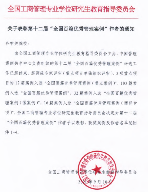 “全国百篇优秀管理案例”是全国工商管理案例领域的最高奖项,本届评选于2021年3月24日启动,全国共有147所院校的1088项案例投稿, 我校MBA教育中心共提交了7篇原创案例,提交数量创历届新高。近五年,我校共有6篇案例获得“全国百篇优秀管理案例”,8篇案例入选“中国管理案例共享中心案例库”,1篇案例入选“中国工商管理国际案例库”。