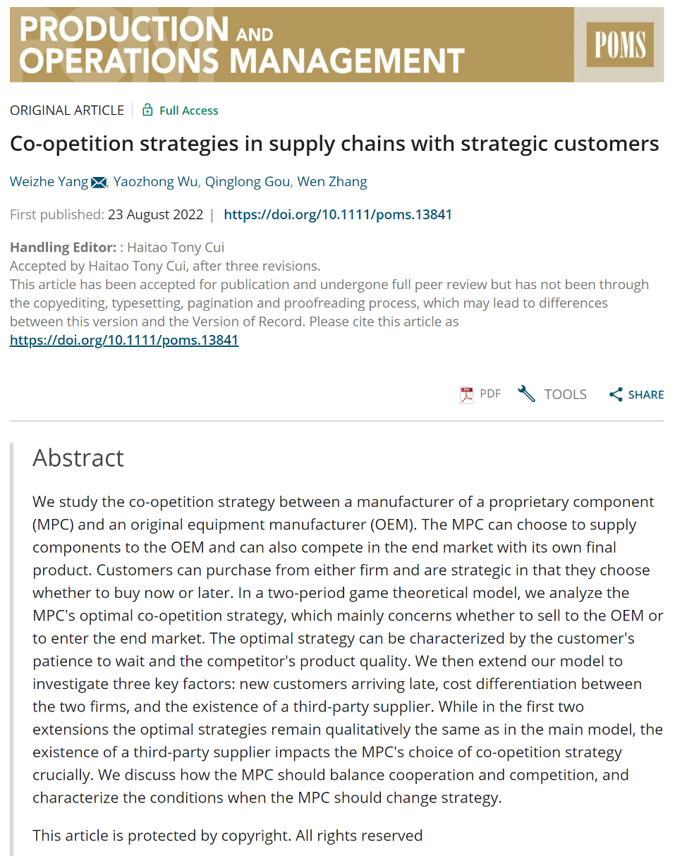 张文博士与中国科学技术大学博士生杨维哲、苟清龙教授以及新加坡国立大学Yaozhong Wu副教授合作的论文“Co-opetition strategies in supply chains with strategic customers”在管理学领域国际顶级期刊《Production and Operations Management》在线发表。Production and Operations Management是美国德克萨斯大学达拉斯分校(University of Texas at Dallas)评定的春满四合院