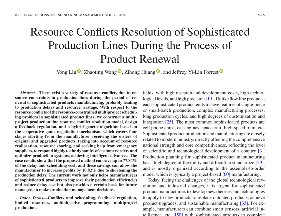 刘勇教授团队在工程管理领域重要期刊《IEEE Transactions on Engineering Management》发表题为“Resource Conflicts Resolution of Sophisticated Production Lines During the Process of Product Renewal”的研究论文。