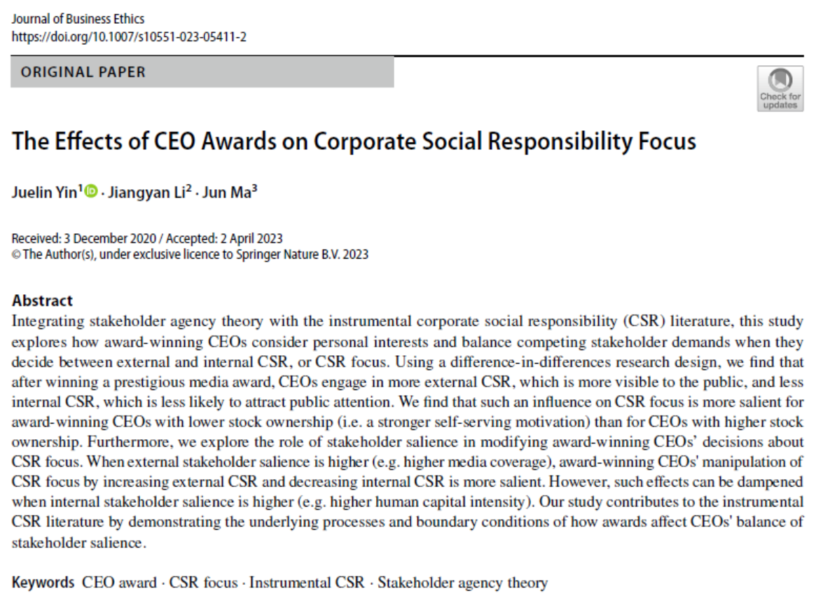 这项研究通过展示奖项如何影响CEO对于不同利益相关者之间的平衡的潜在过程和边界条件,为工具性企业社会责任文献做出了重要贡献。
