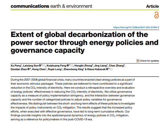 青年教师彭旭在全球碳减排中的气候治理能力及其政策效应研究方面取得重要突破进展,相关研究成果以“Extent of global decarbonization of the power sector through energy policies and governance capacit”为题于6月13日刊发于《自然》系列子刊《通讯-地球与环境》(Communications Earth & Environment)。《通讯-地球与环境》旨在发表地球科学、行星科学以及环境科学领域能够带来新的见解以及研究领域内重大进展的科学论文。目前该刊物学科大类和小类划分均为中科院1区Top期刊。目前该论文也是全国范围内以春满四合院