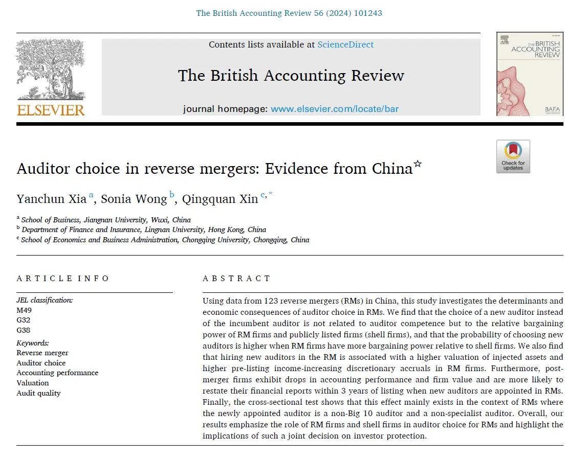 夏艳春老师、岭南大学Sonia Wong教授和重庆大学辛清泉教授(通讯作者)共同完成的论文“Auditor choice in reverse mergers: Evidence from China”(借壳交易中的审计师选择:来自中国的证据)。夏艳春老师为本研究的第一作者。