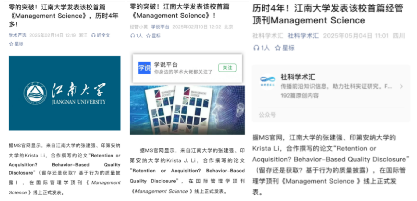 这是张建强教授第二次在《Management Science》发表学术成果,上一篇成果《Quality Disclosure under Consumer Loss Aversion》还入选了《Management Science》的年度最佳论文Finalist,在我国高校和科研院所中是极其少见的荣誉。
