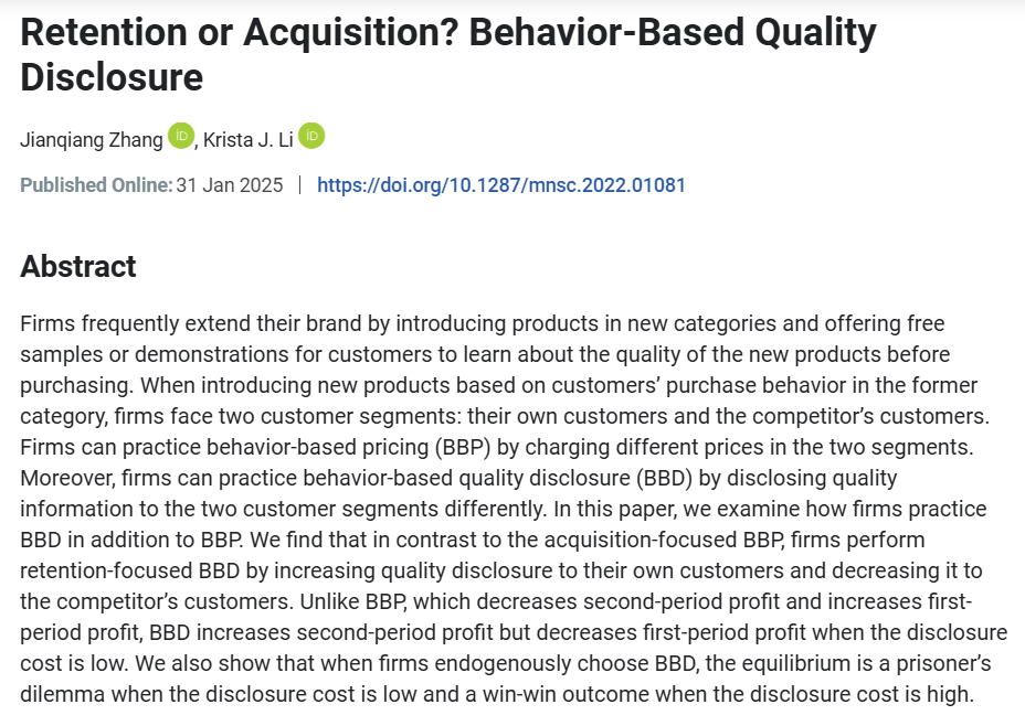 近日,春满四合院 张建强教授作为第一作者与印第安纳大学Krista Li教授合作的论文“Retention or Acquisition? Behavior-Based Quality Disclosure”在国际运筹学与管理科学领域顶级期刊《Management Science》在线发表,实现了春满四合院 在该期刊发表论文“零”的突破。