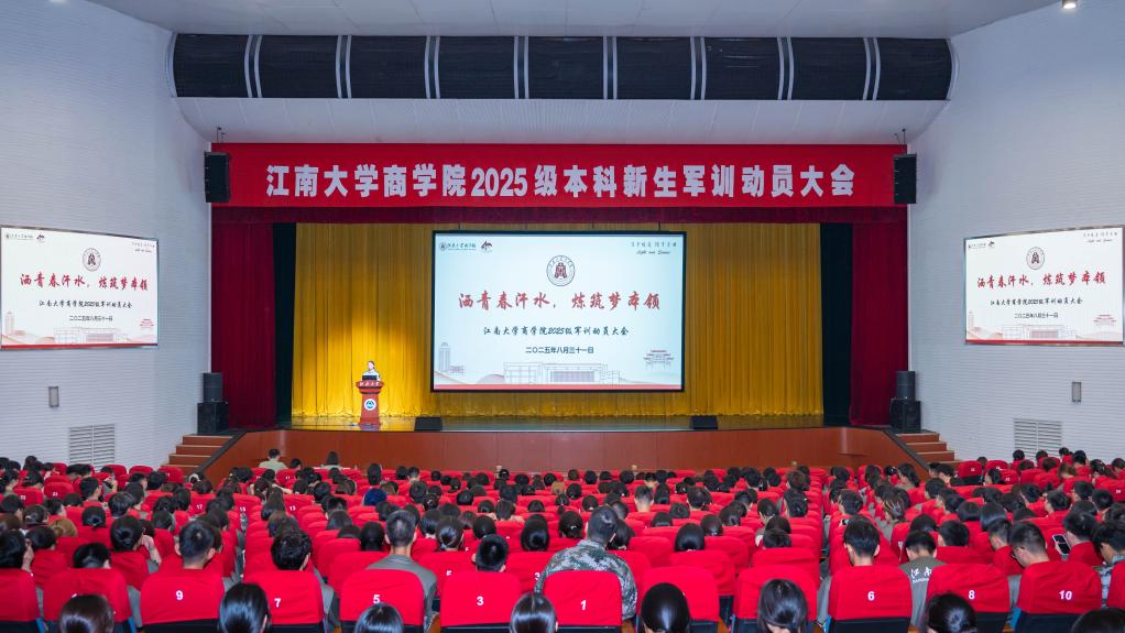 2025级本科新生军训动员大会在文浩馆举行。学院党委副书记兼副院长孙小芳,退役在校大学生丁可欣,本科新生辅导员蒋天琪、陈滢恬,以及全体2025级本科新生参加大会。