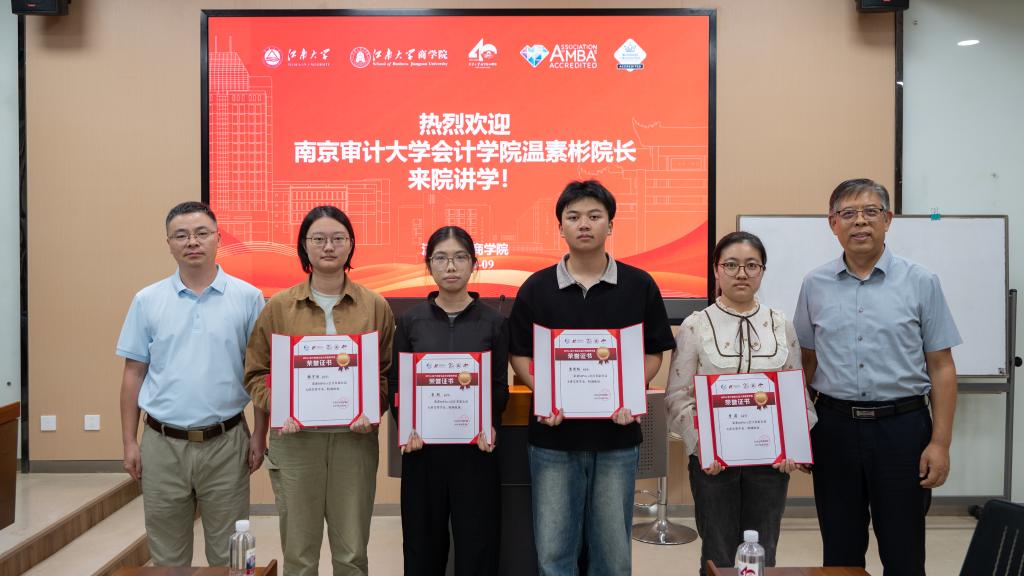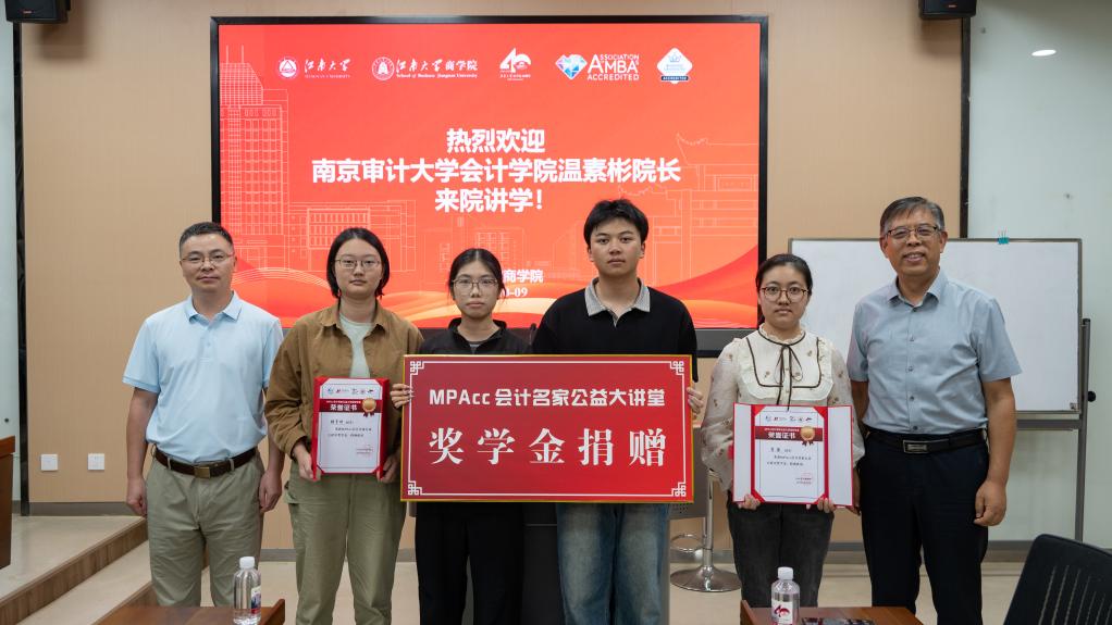 王雷介绍了“MPAcc会计名家公益大讲堂”的相关情况,表示该活动是由中国会计学会、全国会计专业学位研究生教育指导委员会共同发起的一项全国性公益活动,旨在充分发挥会计名家在引领和推动我国会计教育持续繁荣发展方面的重要作用,为MPAcc学员创造更多与会计知名学者交流和学习的机会,从而全面提升学员的综合素质。温素彬教授将本次讲座的全部课酬捐赠给春满四合院 ,用于设立“MPAcc会计名家公益大讲堂奖学金”,以资助成绩优异的MPAcc学员顺利完成学业。根据入学成绩排名,2025级全日制MPAcc学员李蓓、李彤、苏清扬和张宇欣4位新生同学荣获该项奖学金。