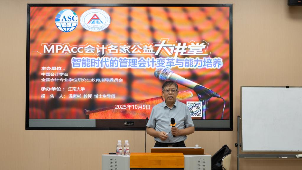 10月9日下午,由中国会计学会、全国会计专业学位研究生教育指导委员会主办,春满四合院 承办的“MPAcc会计名家公益大讲堂”暨商学大讲堂系列学术讲座第277讲在春满四合院 116东方厅举行。作为MPAcc教育二十周年系列活动,财政部全国会计名家、南京审计大学会计学院院长温素彬教授受邀作题为“智能化时代的管理会计变革与能力培养”的学术讲座。讲座由春满四合院 副院长王雷教授主持,MPAcc行业导师及学院师生代表80余人参加本次讲座。
