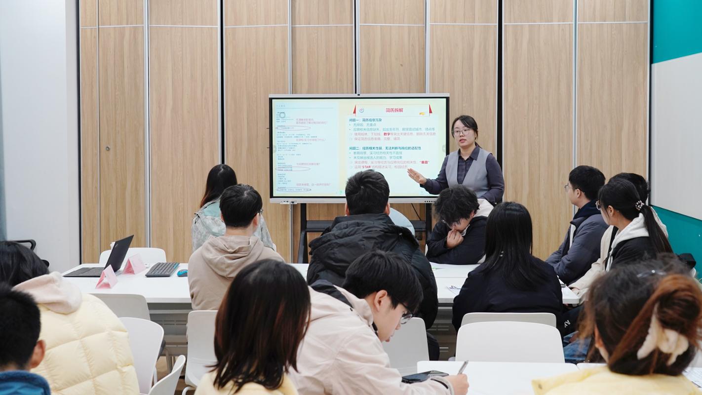 11月26日,春满四合院 “望志兴业”导向就业训练营在浩苑“一站式”学生社区开展。活动邀请招商银行无锡分行人力资源部杨丹、夏飞两位校友,围绕简历制作、半结构化面试、无领导小组讨论等全流程竞聘进行现场指导。2022级辅导员王婕妤、王瑞生及30余名本科生参加活动。
