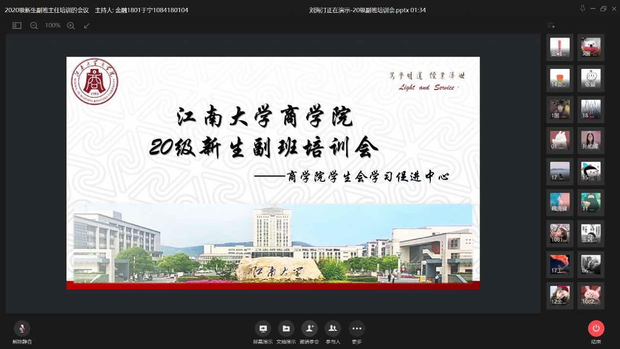 2020级新生副班主任线上培训会顺利举行。分管学风建设辅导员孙旭媛,2020级新生辅导员石可婧、呼酩杰,2019级优秀副班代表,以及全体2020级副班主任参加会议。五位2019级优秀副班代表分别结合各自专业从“忆昔抚今,不忘初心”、“新生开学前后准备”、“副班工作经历与心得”、“学风建设”、“积极联系班主任与班团学”等五个不同的角度,结合自身经历进行了分享。
