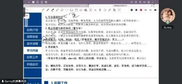 成功考取北京师范大学国际商务专业硕士的陈可馨同学以自身考研经历为例,对复试的院校考情进行了详细梳理,强调要及时关注目标院校的复试要求和动态信息,专业课的学习和面试时的输出表现是考研复试成功的关键。她提醒同学们不必过于紧张,可通过模拟面试、反复练习、注重仪容仪表等方式从容地面对复试。最后她从自我介绍准备、英语口语、专业课问答、综合素质考察等方面,向同学们分享了复试技巧以及心态调整方式。
