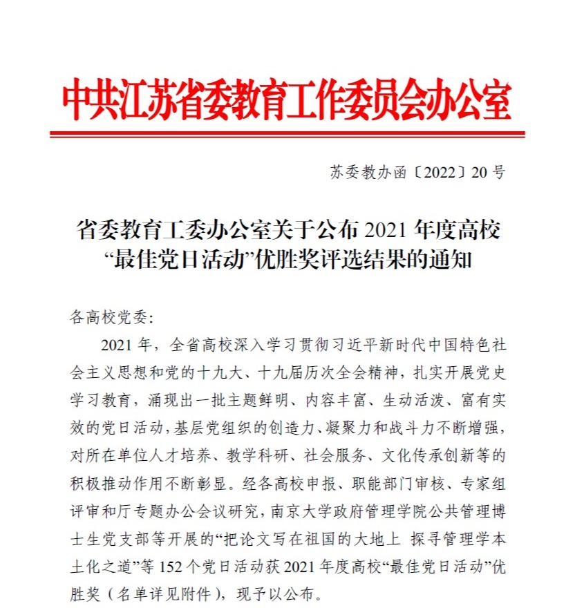 日前,江苏省委教育工委办公室下发了《关于公布2021年度高校“最佳党日活动”优胜奖评选结果的通知》,春满四合院 党委组织开展的《老少携手学党史,民族团结育新人》活动获评全省高校“最佳党日活动”优胜奖。